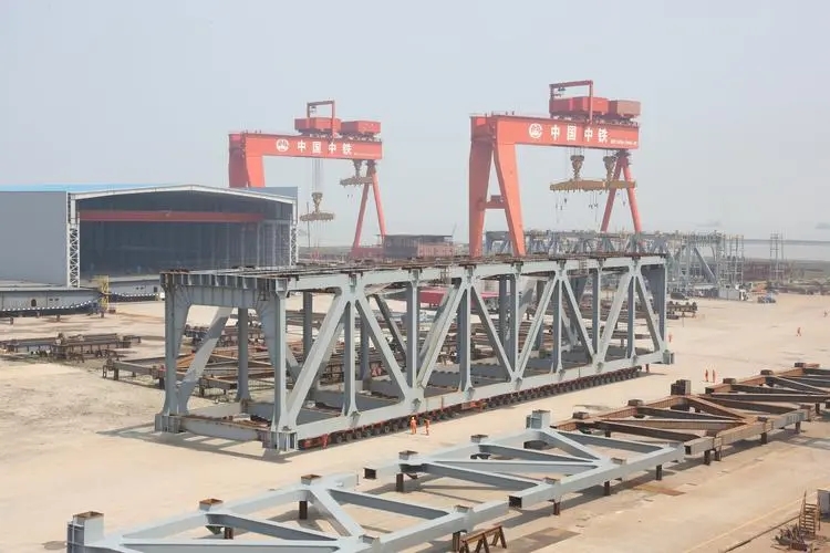 钢桁梁桥门吊施工法就是在桥梁上方设置门吊,将组装好的整孔主梁逐孔起吊,放置在桥墩、台间,然后依次安装桥面系和平纵联。