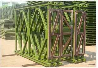 贝雷片由上、下弦杆、竖杆及斜杆焊接而成,上下弦杆的端部有阴阳接头,接头上有杵架连接销孔。湖南贝雷片的弦杆由两根10号槽钢(背靠背)组合而成,在下弦杆上,焊有多块带圆孔的钢板,在上、下弦杆内有供与加强弦杆和双层桁架连接的螺栓孔,在上弦杆内还有供连接支撑架用的四个螺栓孔,其中间的两个孔是供双排或多排桁架同节间连接用的。