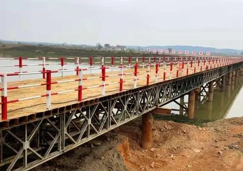 钢便桥是指用钢材临时架设的简便的桥。便桥中的贝雷梁,在我国于20世纪60年代开始定型生产,具有结构简单、运输方便、架设快捷、载重量大、互换性好、适应性强的特点,广泛应用于战备、交通工程、市政水利工程,是我国应用比较广泛的组装式承重构件。