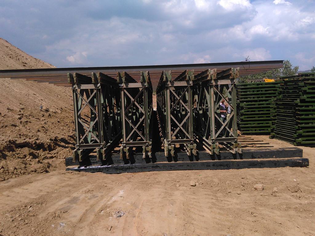 5.装配现场纵向坡度不应大于3%,横向应大致水平.将托辊置于校准托辊的位置,试样板置于托辊下方.每块岩石只能有一排桁架.单排桥架设时,两岸各设两块岩石;架起两、三排桥梁时,两岸各有四个摇臂.在推三排桥时,为了避免妨碍最外层排桁架的顺利通过,应将中间排下方的岩石和滚轮以及外侧的平行移走.